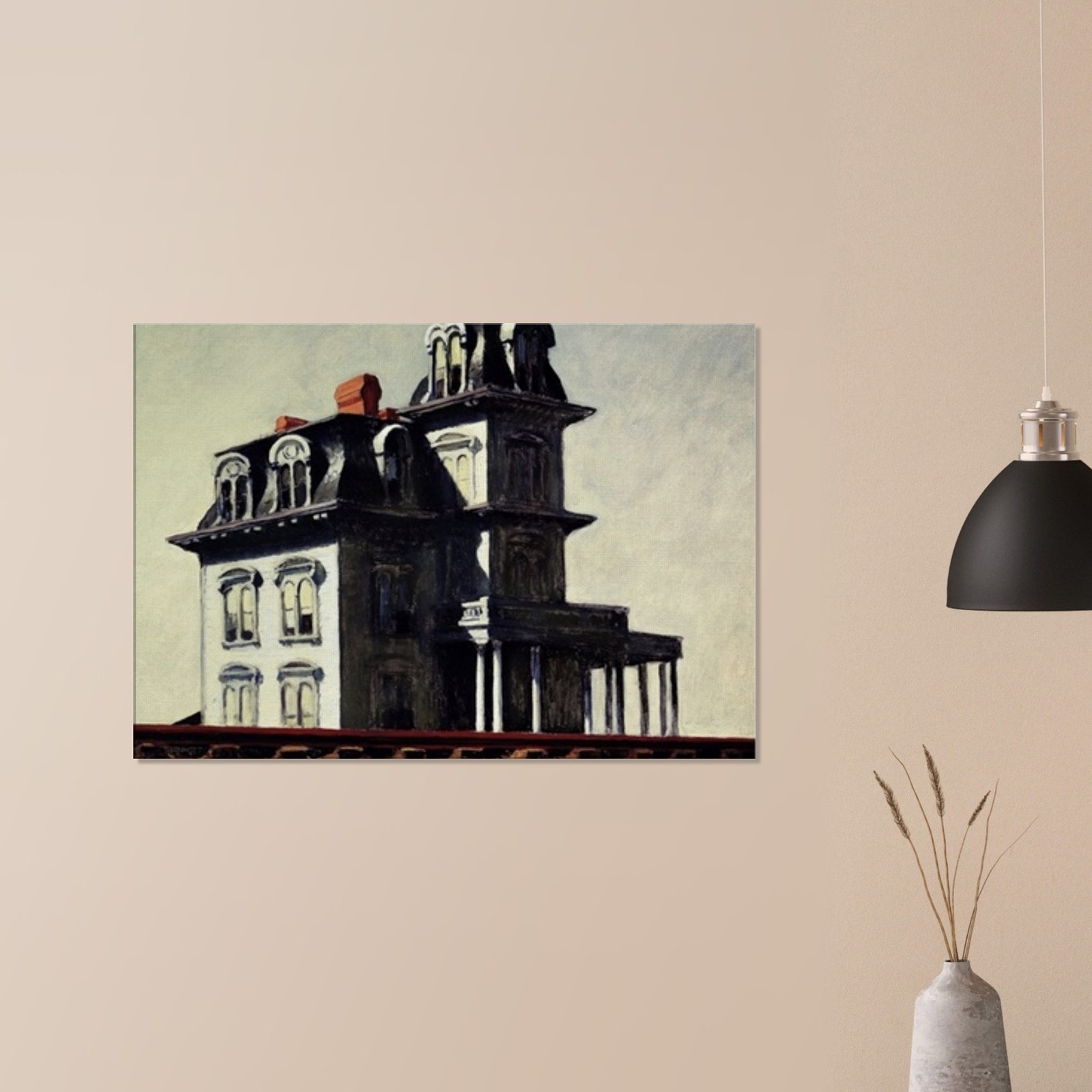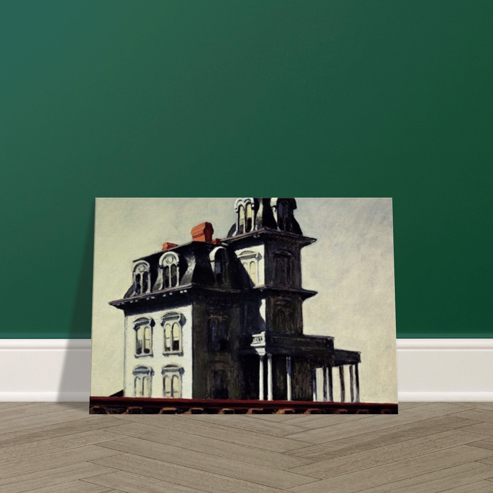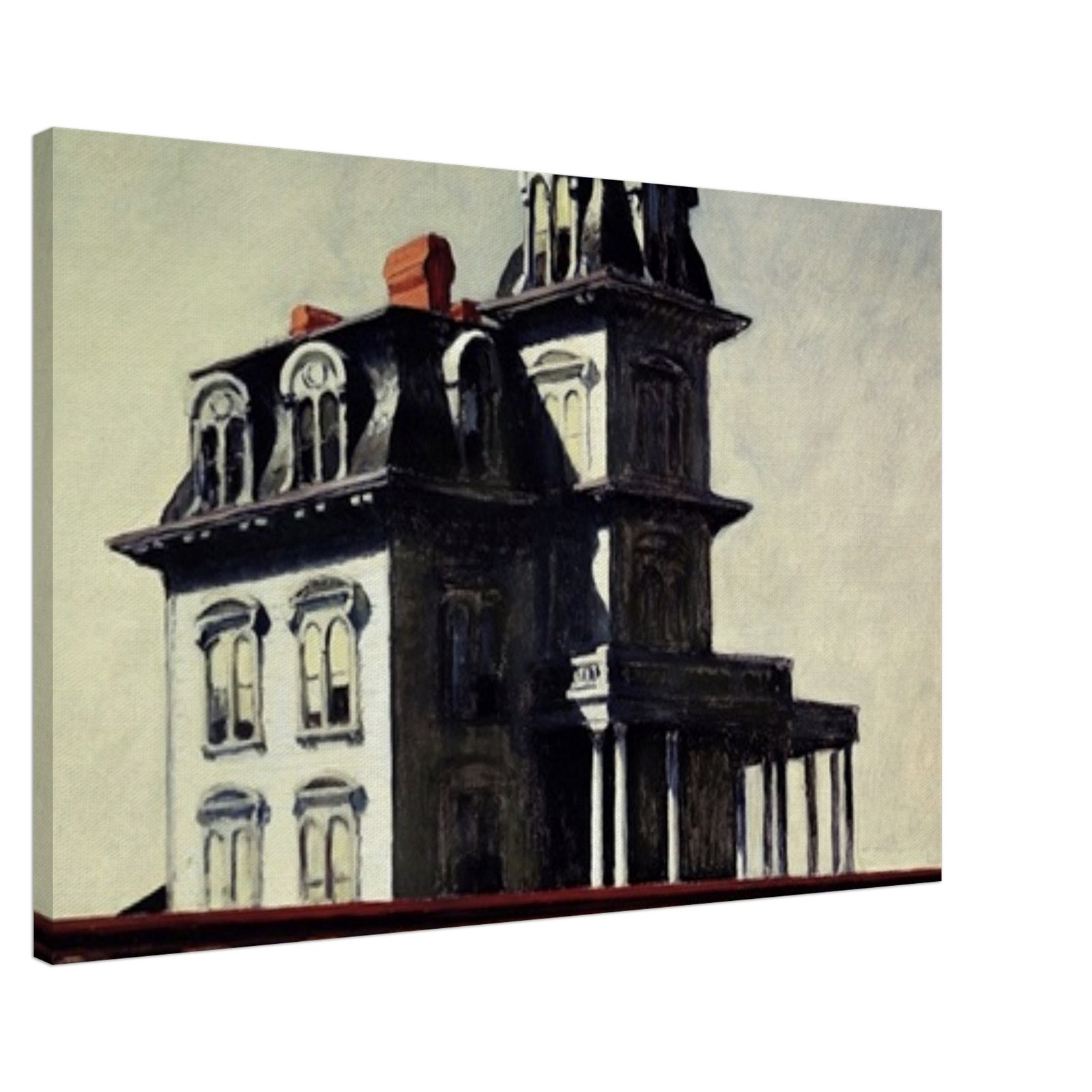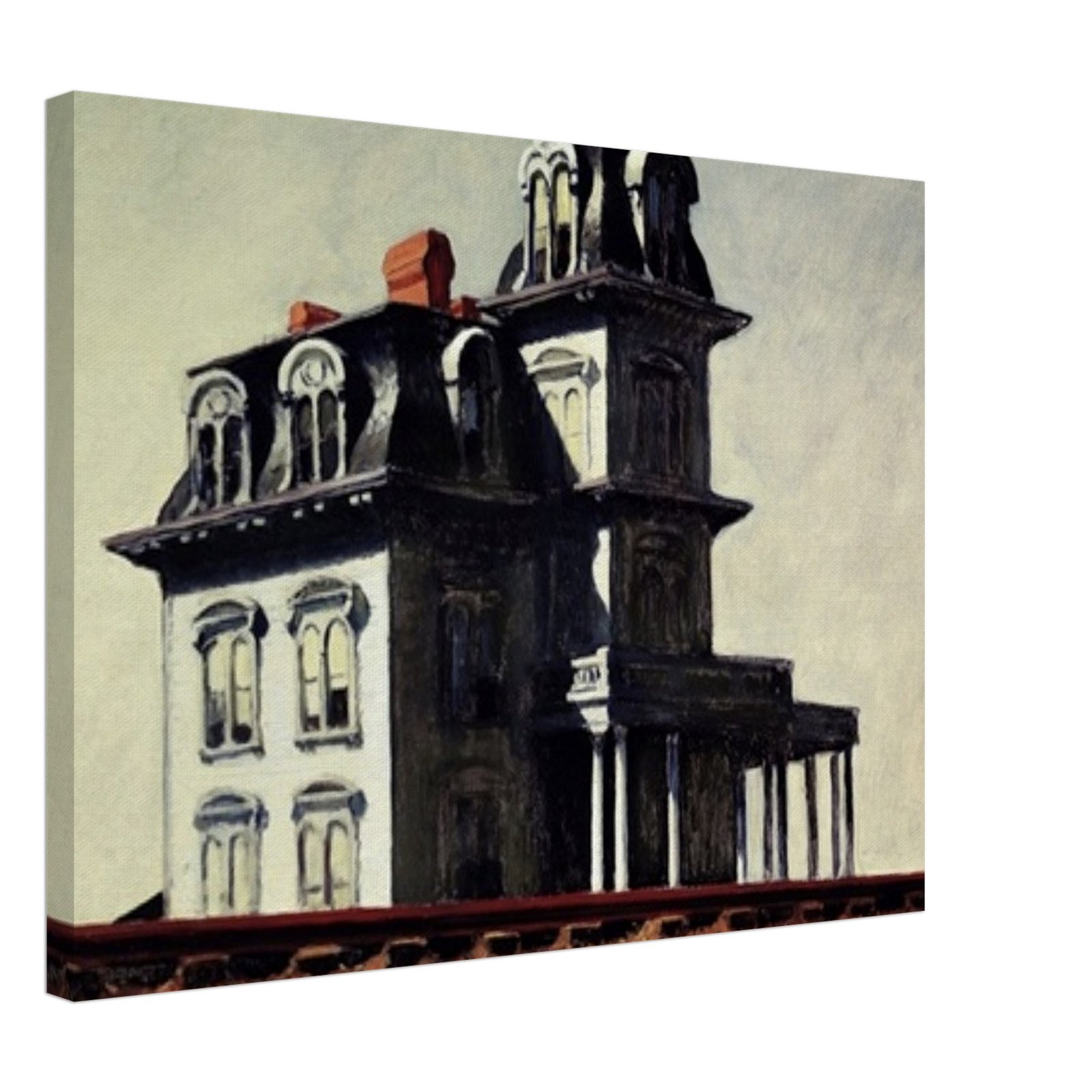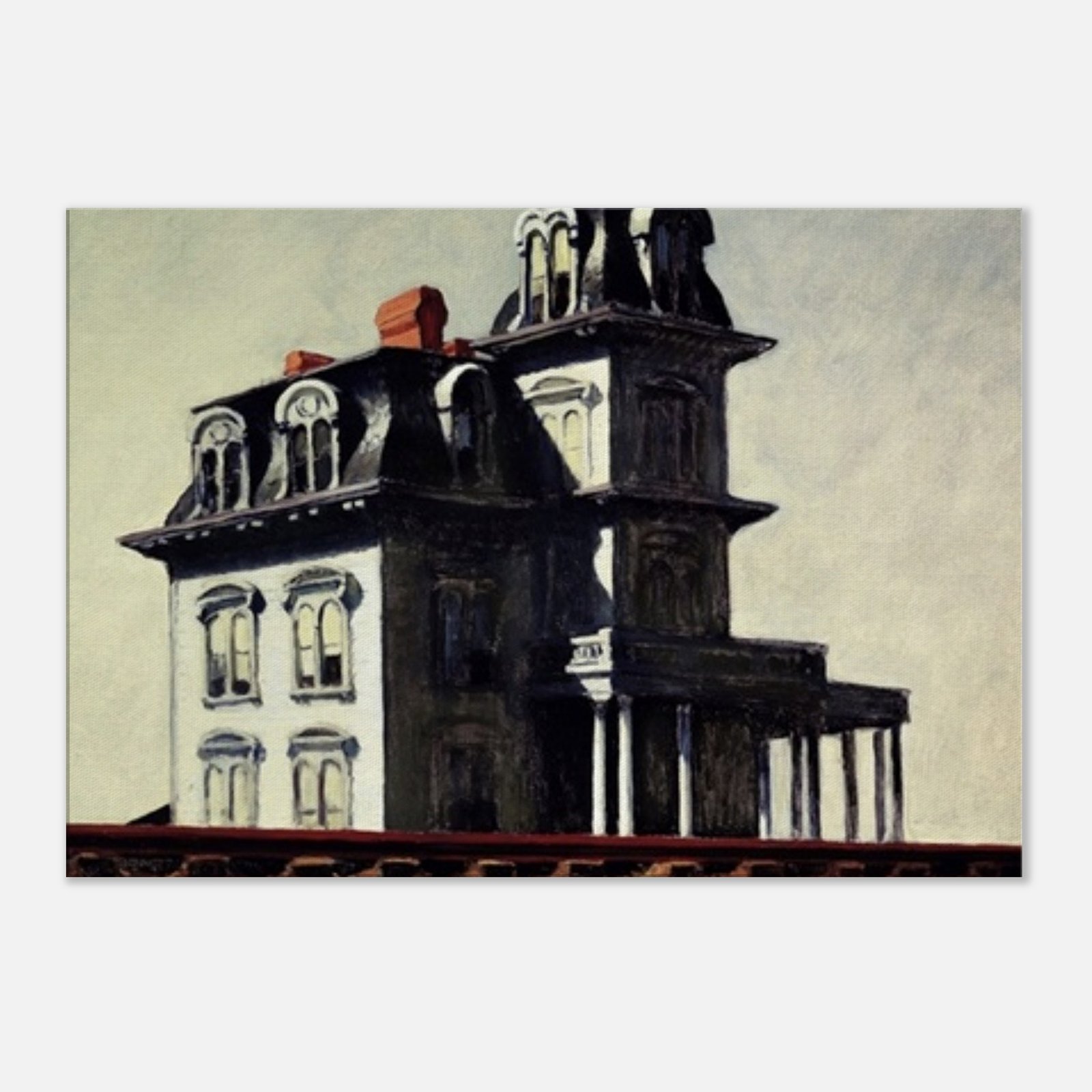 “House by the Railroad” is a hauntingly iconic piece by Edward Hopper, known for its eerie stillness and psychological depth. The Victorian-style mansion stands stark and solitary against an empty sky, its sharp architectural lines casting heavy shadows across its facade. The railroad at the bottom adds a sense of disconnection and passing time, enhancing the image’s quiet isolation. Perfect for lovers of atmospheric art, Gothic architecture, or American realism.