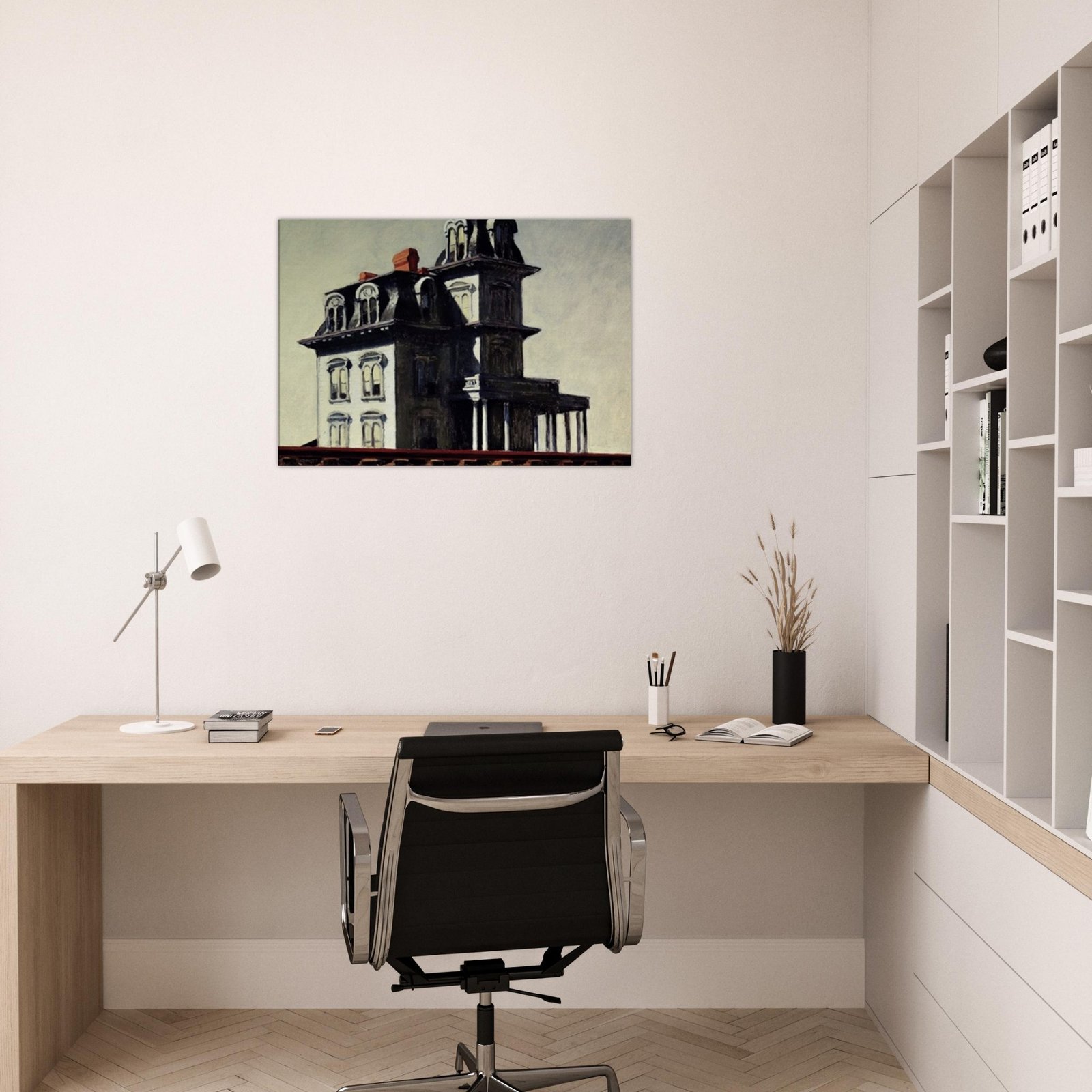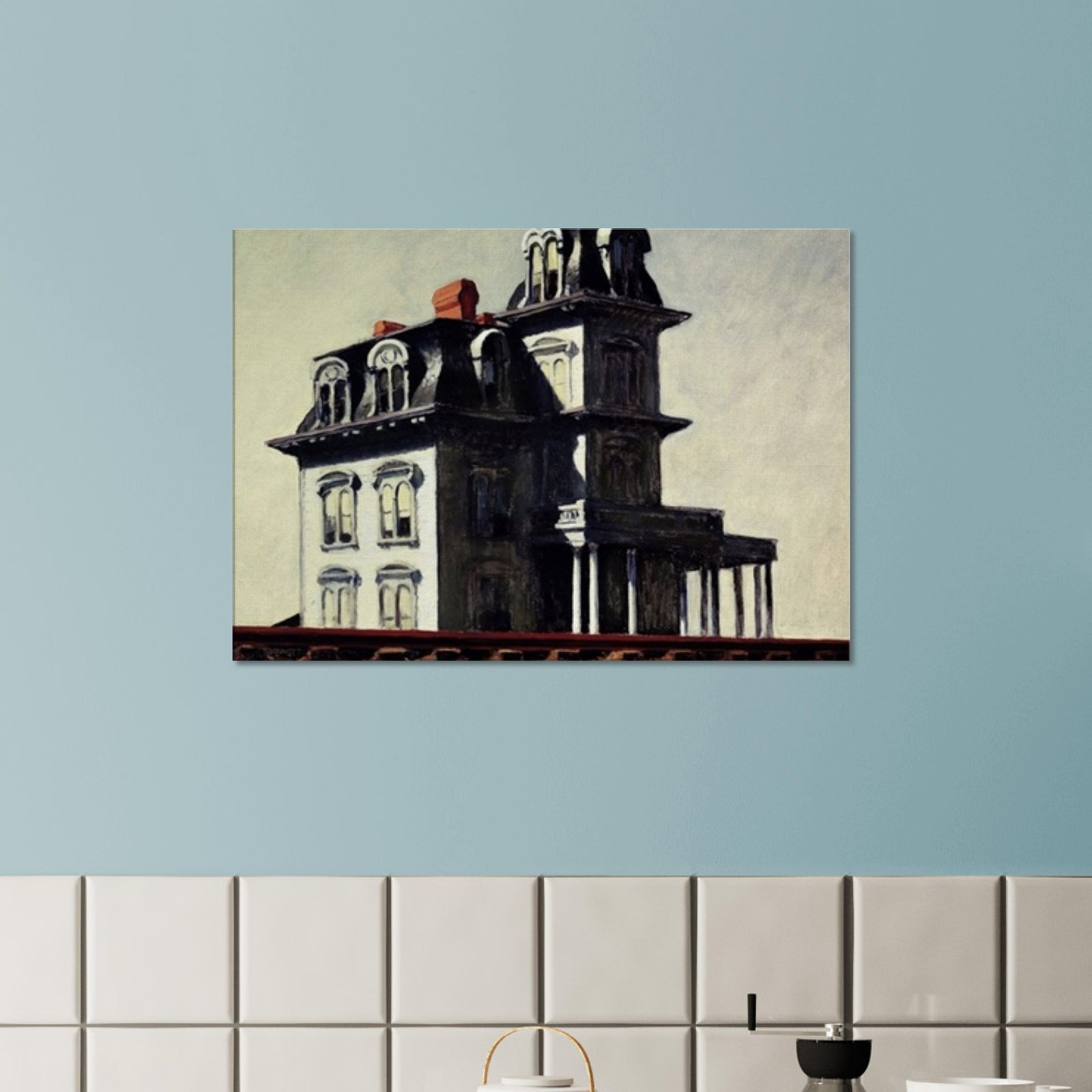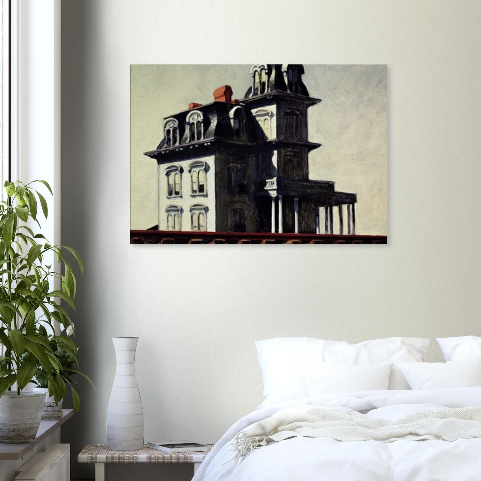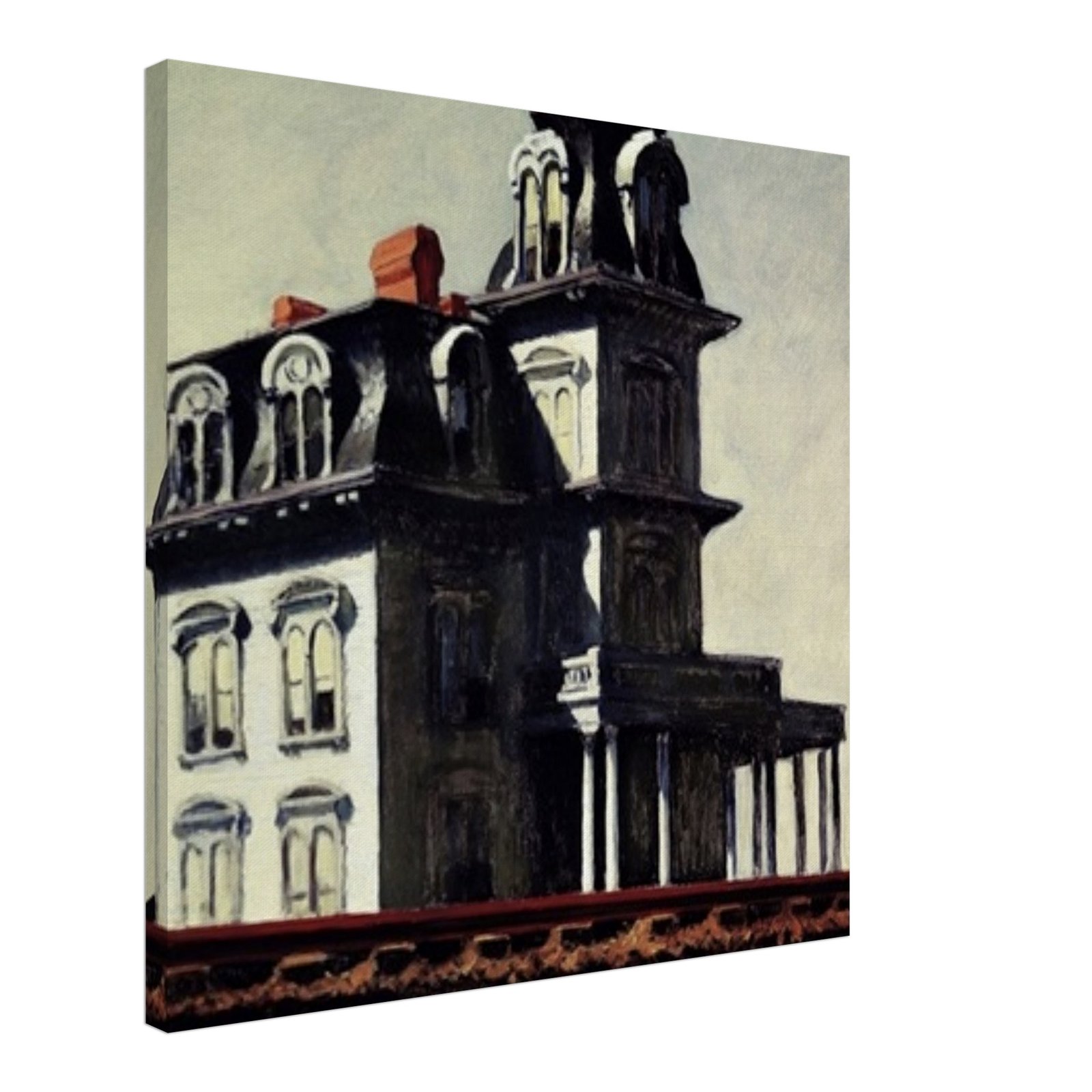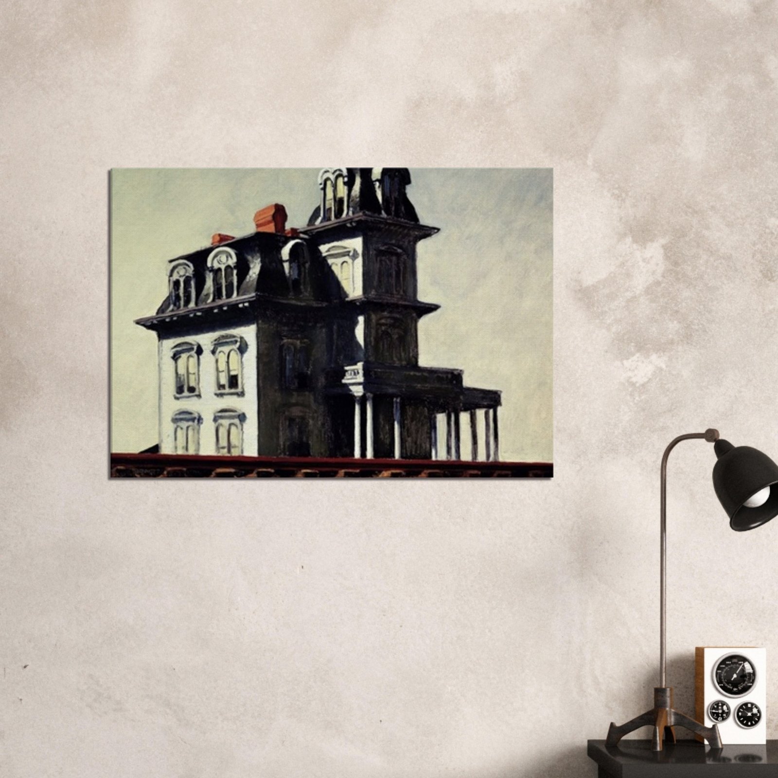 “House by the Railroad” is a hauntingly iconic piece by Edward Hopper, known for its eerie stillness and psychological depth. The Victorian-style mansion stands stark and solitary against an empty sky, its sharp architectural lines casting heavy shadows across its facade. The railroad at the bottom adds a sense of disconnection and passing time, enhancing the image’s quiet isolation. Perfect for lovers of atmospheric art, Gothic architecture, or American realism.