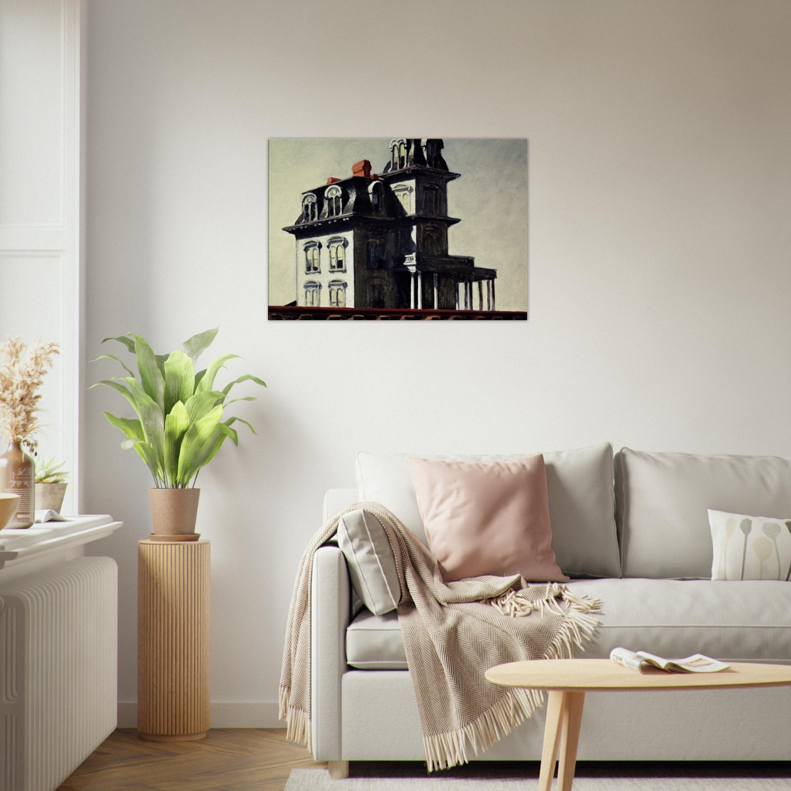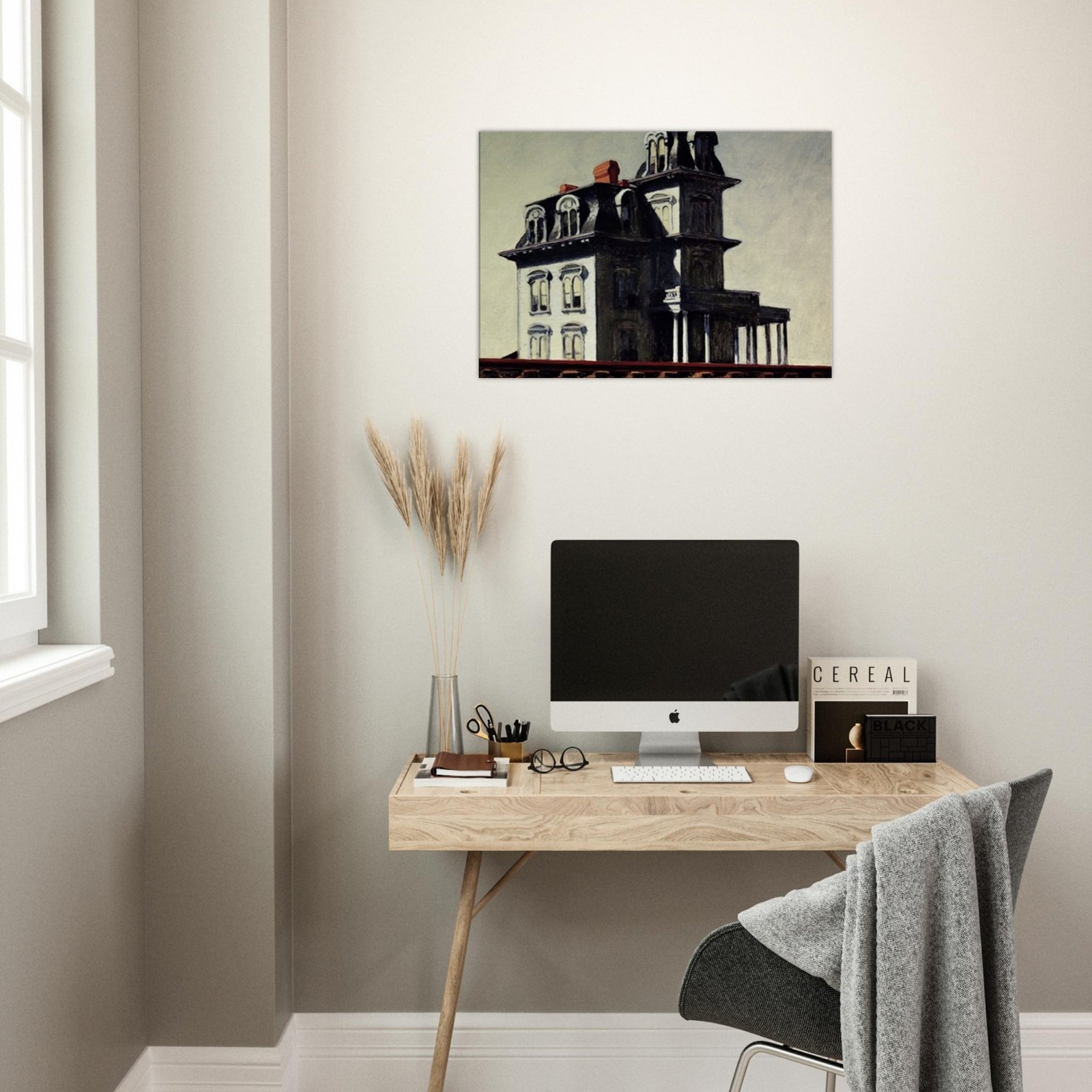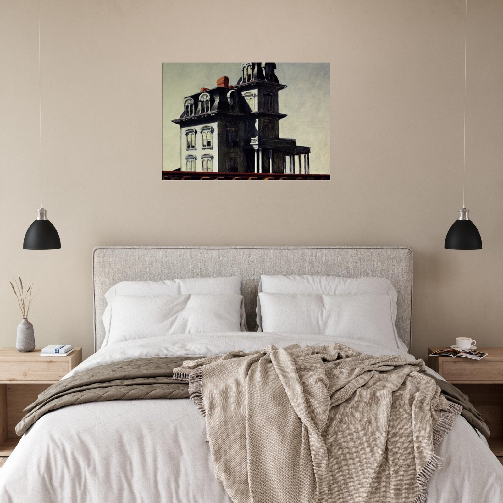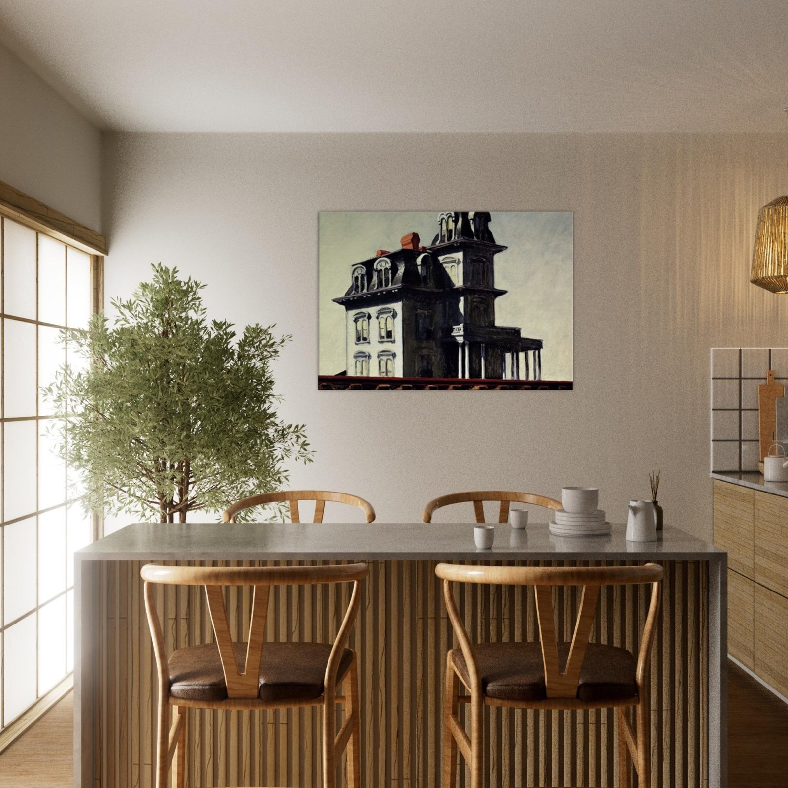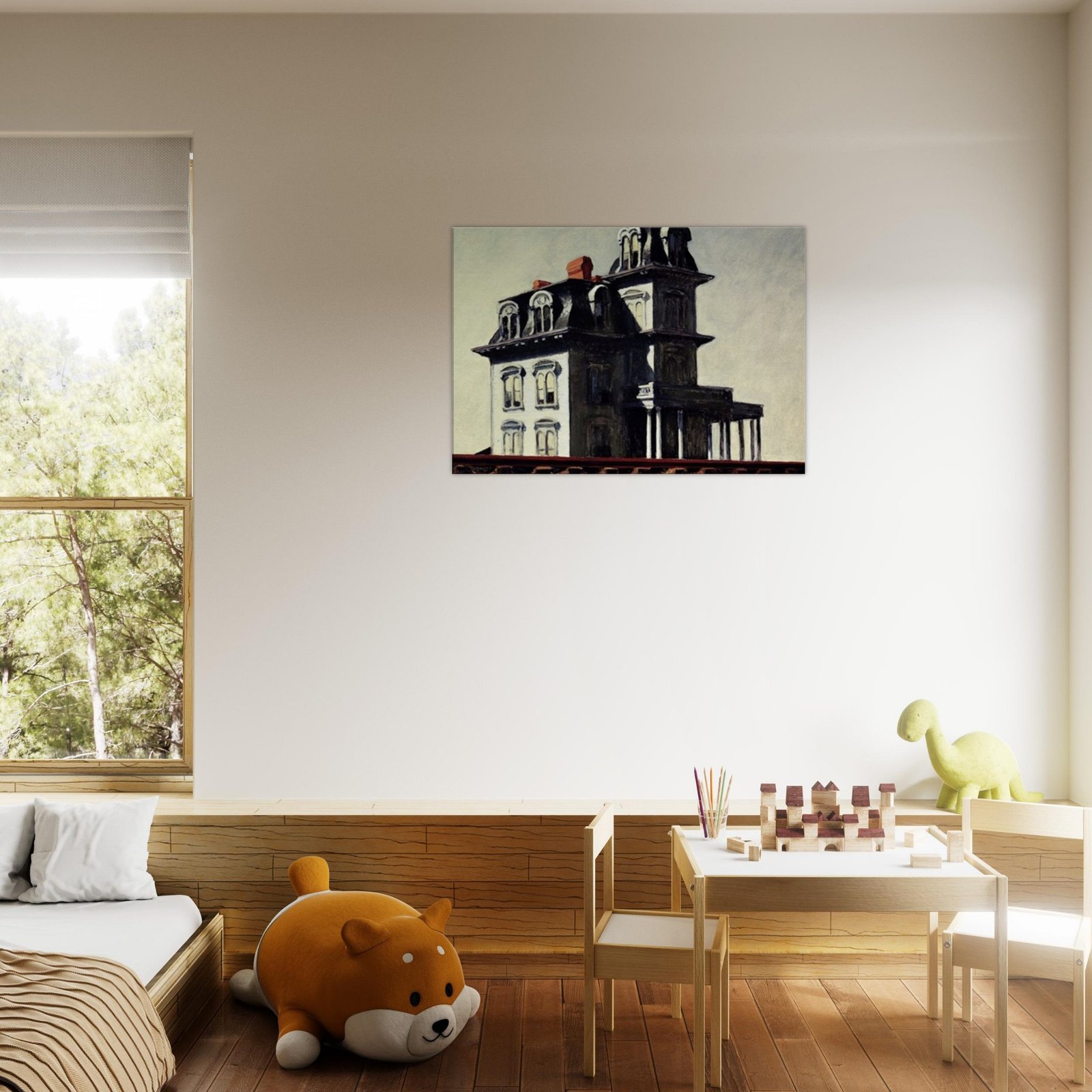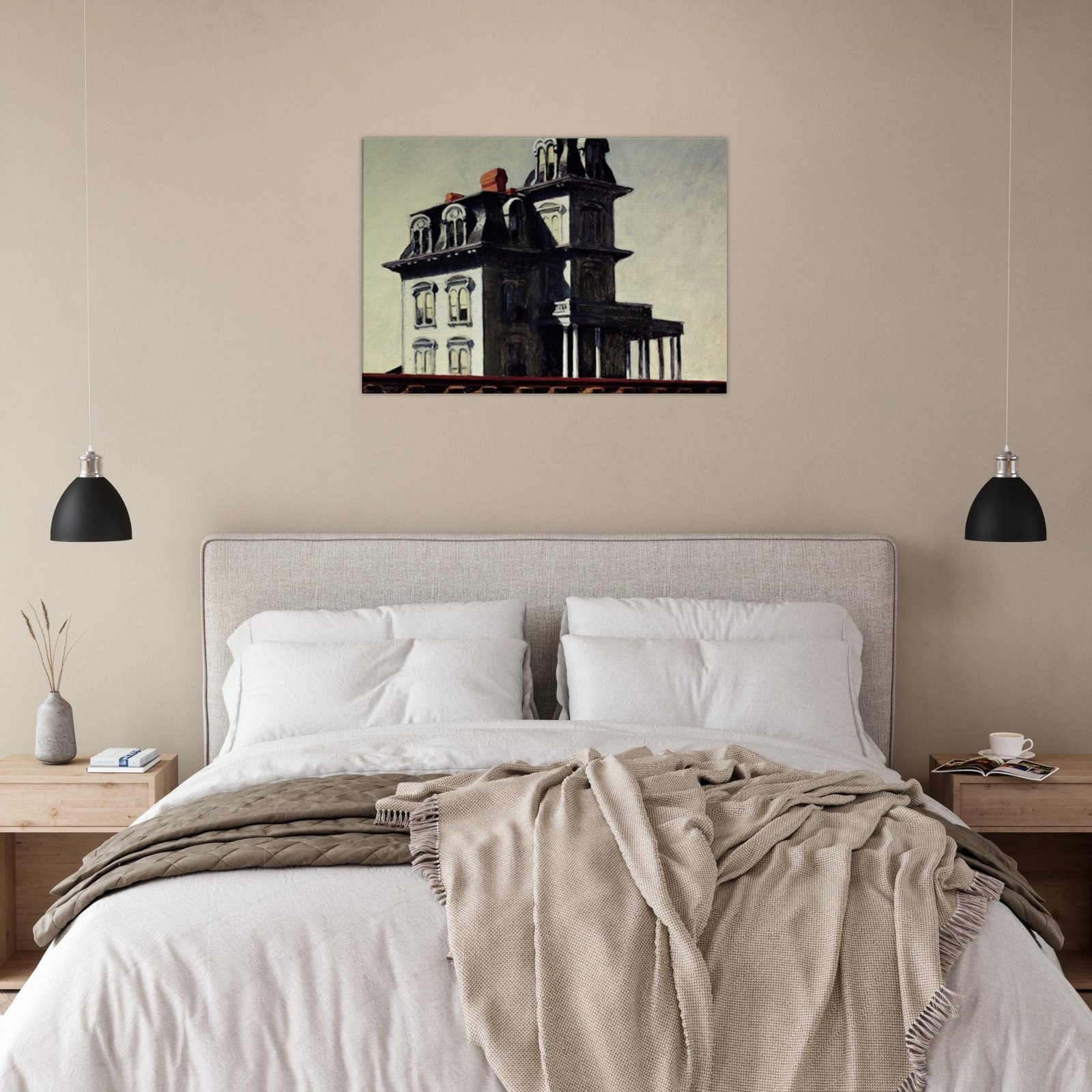 “House by the Railroad” is a hauntingly iconic piece by Edward Hopper, known for its eerie stillness and psychological depth. The Victorian-style mansion stands stark and solitary against an empty sky, its sharp architectural lines casting heavy shadows across its facade. The railroad at the bottom adds a sense of disconnection and passing time, enhancing the image’s quiet isolation. Perfect for lovers of atmospheric art, Gothic architecture, or American realism.