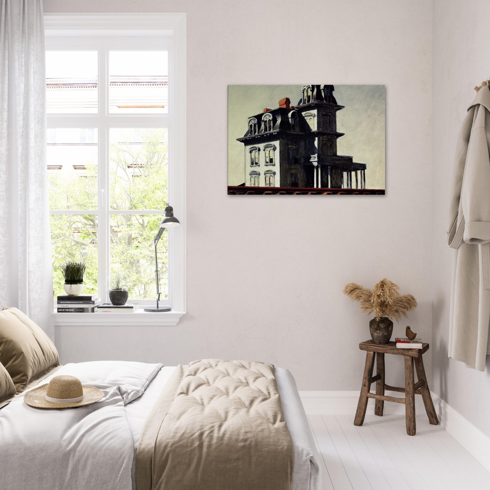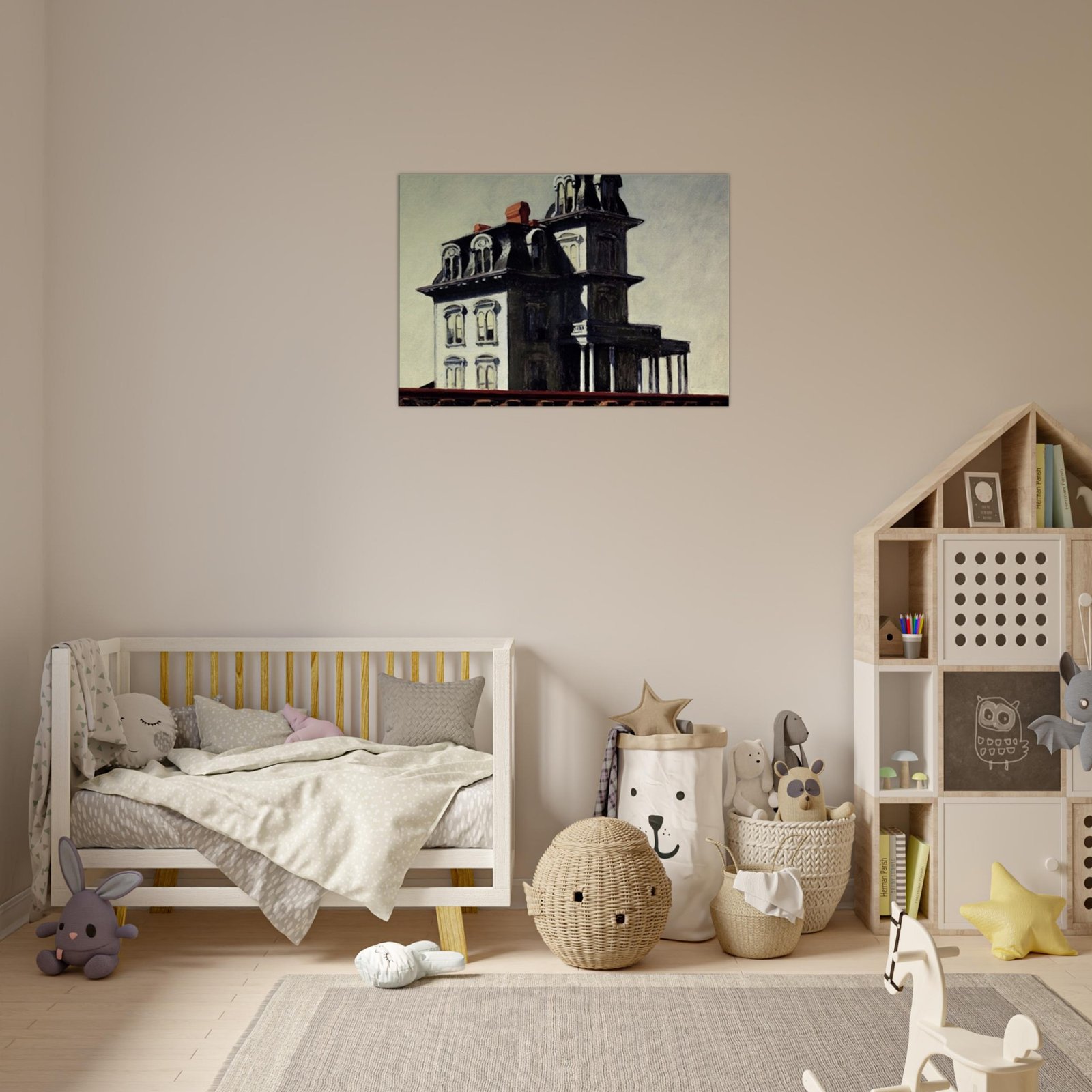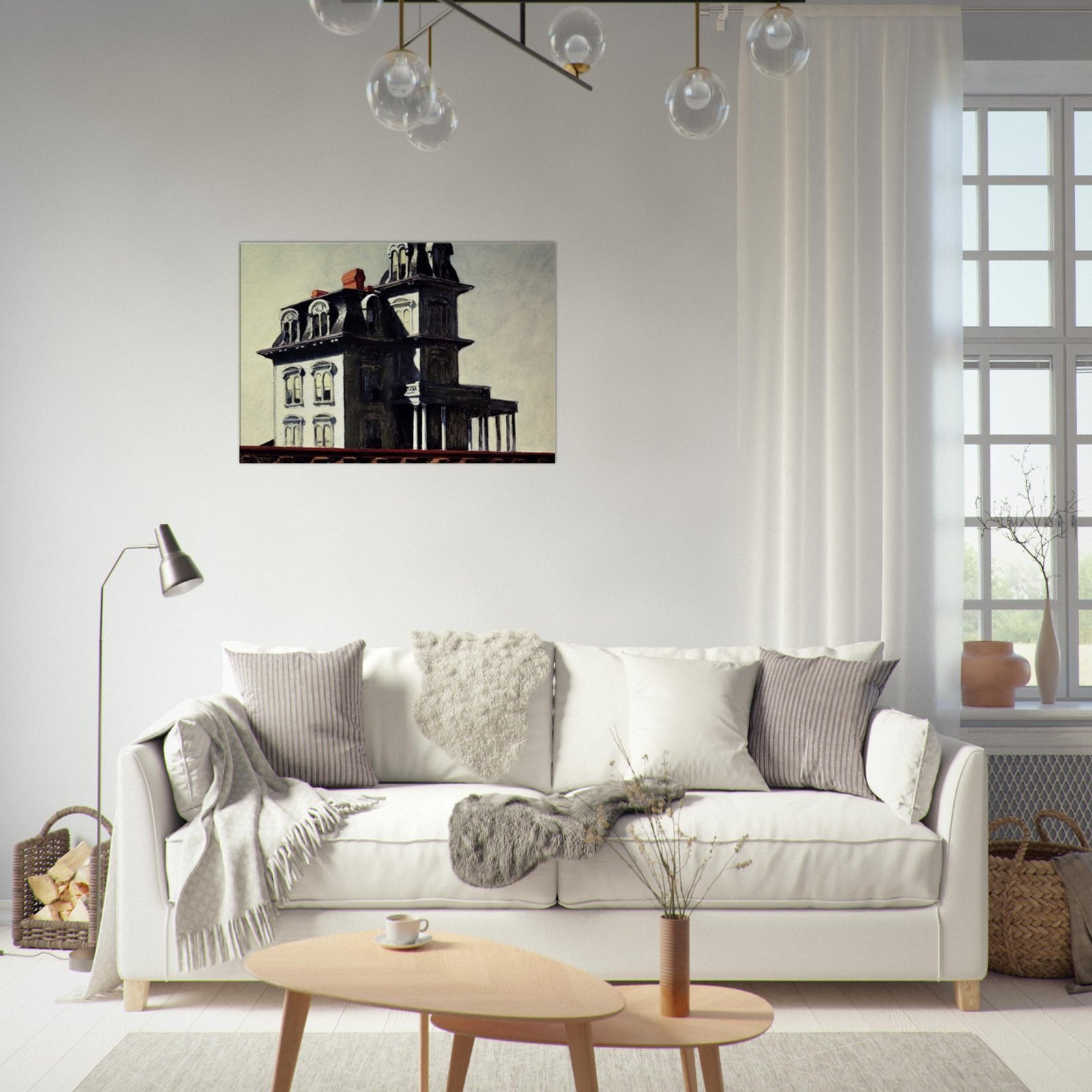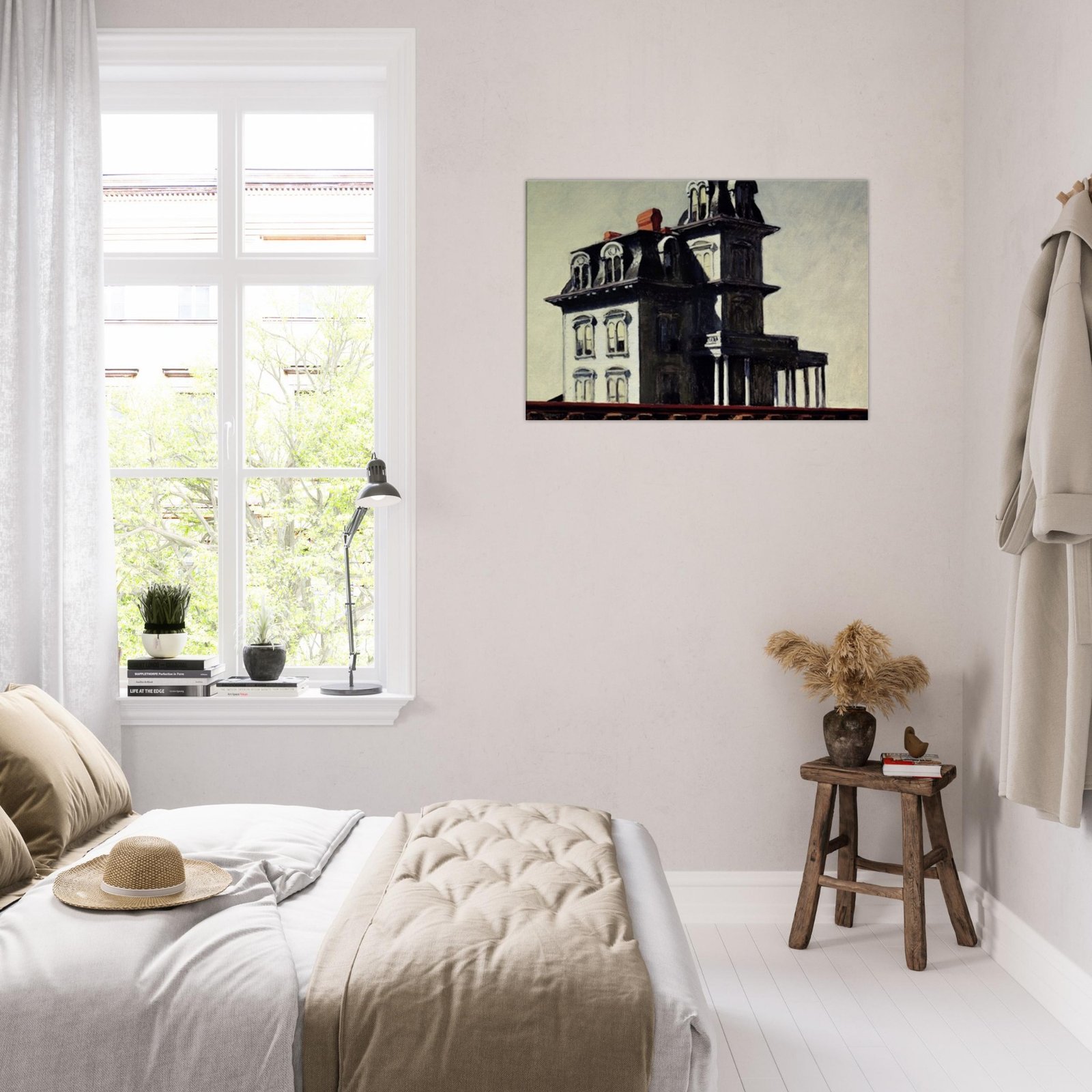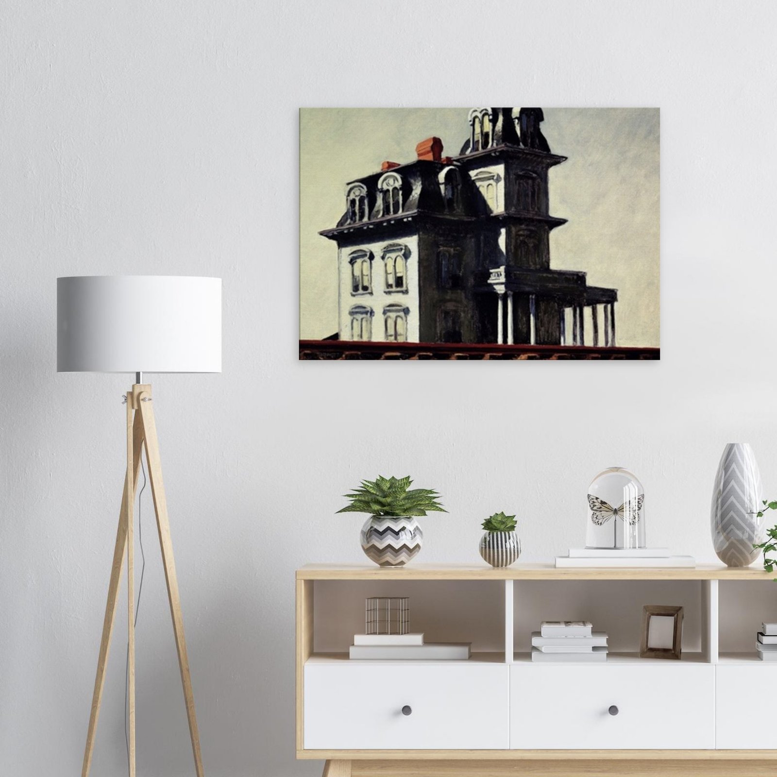 “House by the Railroad” is a hauntingly iconic piece by Edward Hopper, known for its eerie stillness and psychological depth. The Victorian-style mansion stands stark and solitary against an empty sky, its sharp architectural lines casting heavy shadows across its facade. The railroad at the bottom adds a sense of disconnection and passing time, enhancing the image’s quiet isolation. Perfect for lovers of atmospheric art, Gothic architecture, or American realism.