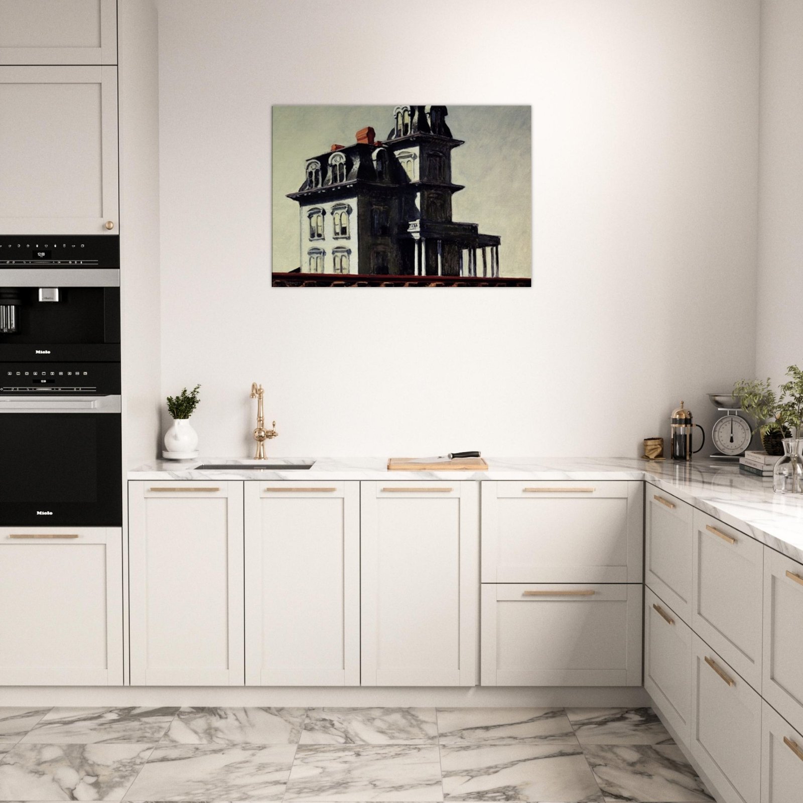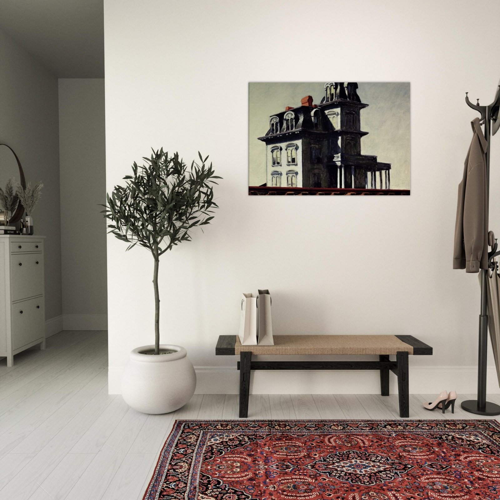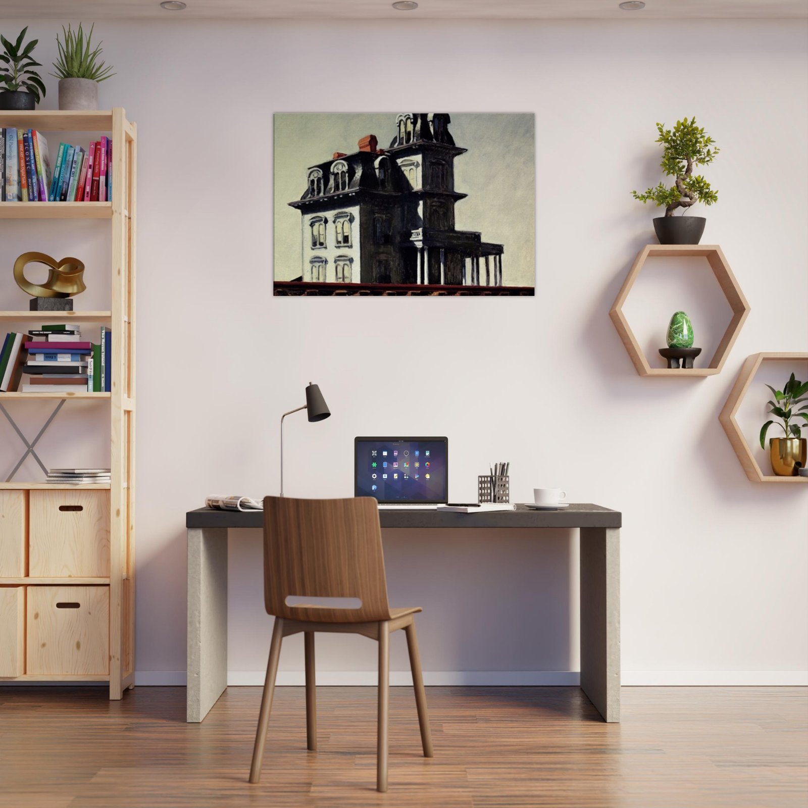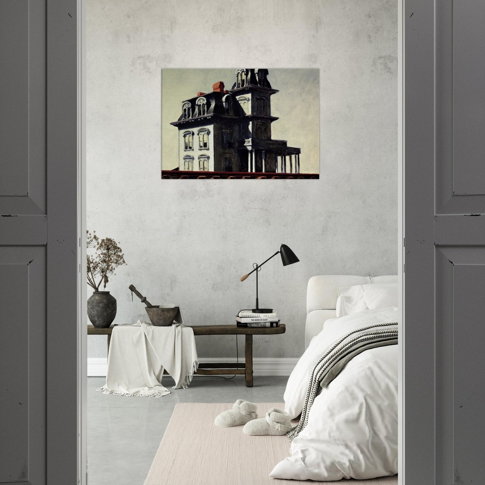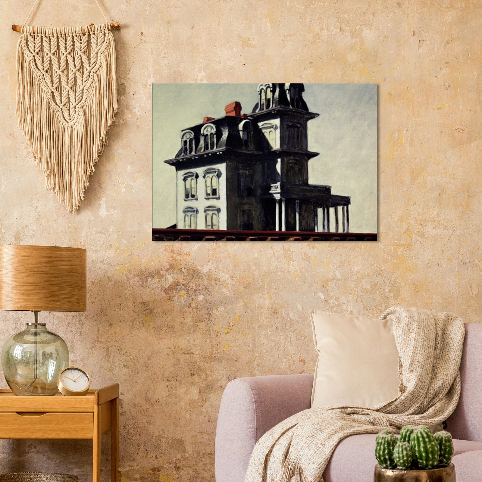 “House by the Railroad” is a hauntingly iconic piece by Edward Hopper, known for its eerie stillness and psychological depth. The Victorian-style mansion stands stark and solitary against an empty sky, its sharp architectural lines casting heavy shadows across its facade. The railroad at the bottom adds a sense of disconnection and passing time, enhancing the image’s quiet isolation. Perfect for lovers of atmospheric art, Gothic architecture, or American realism.