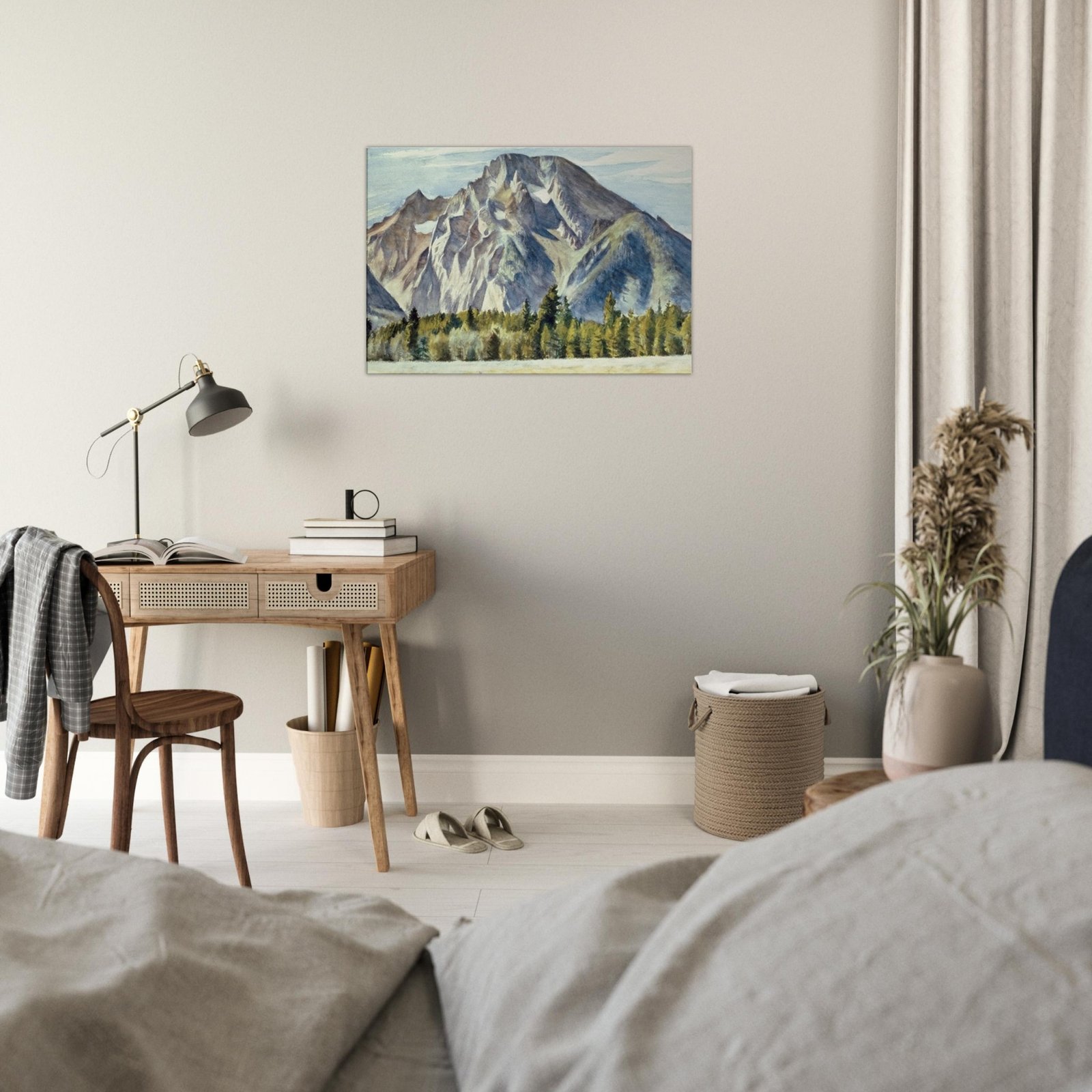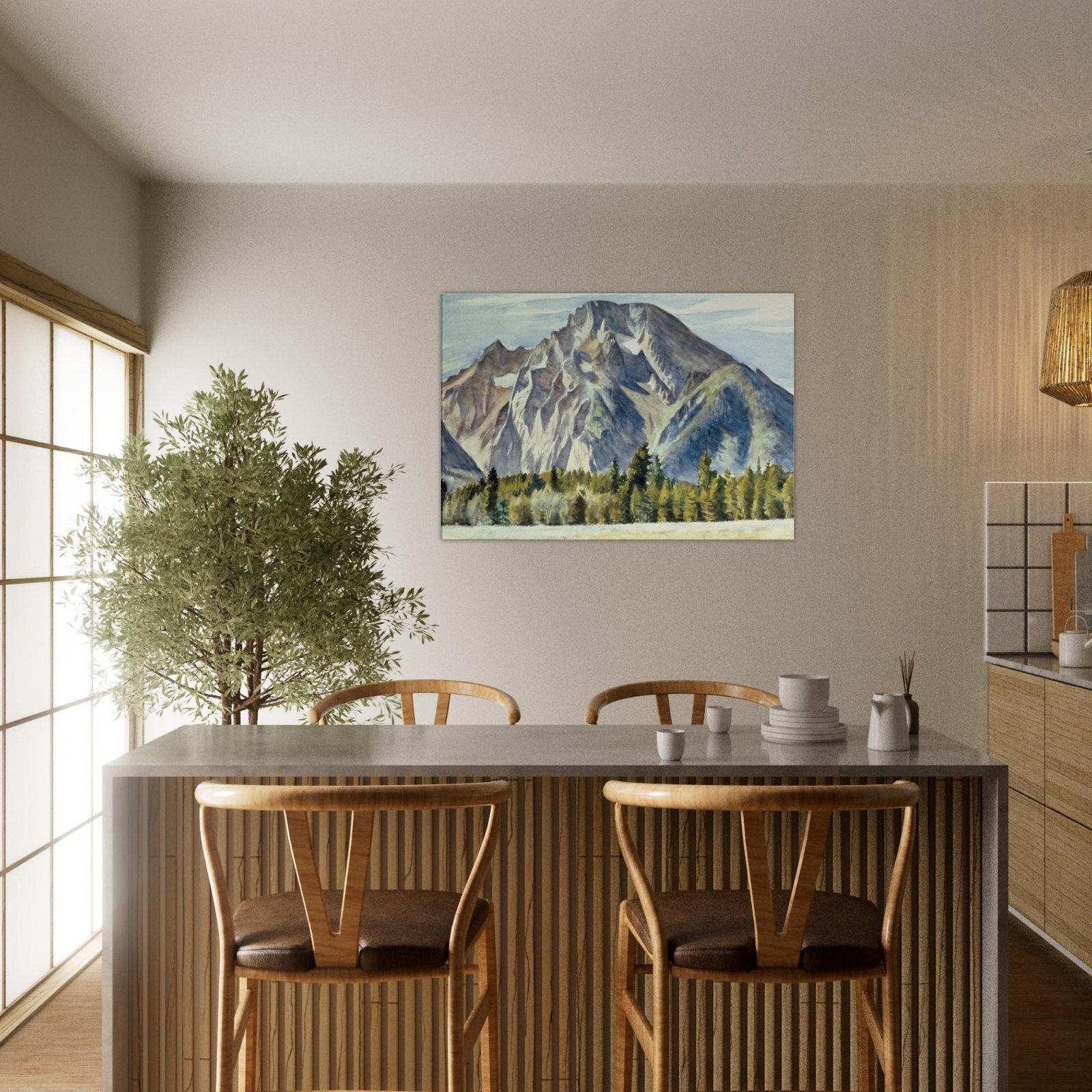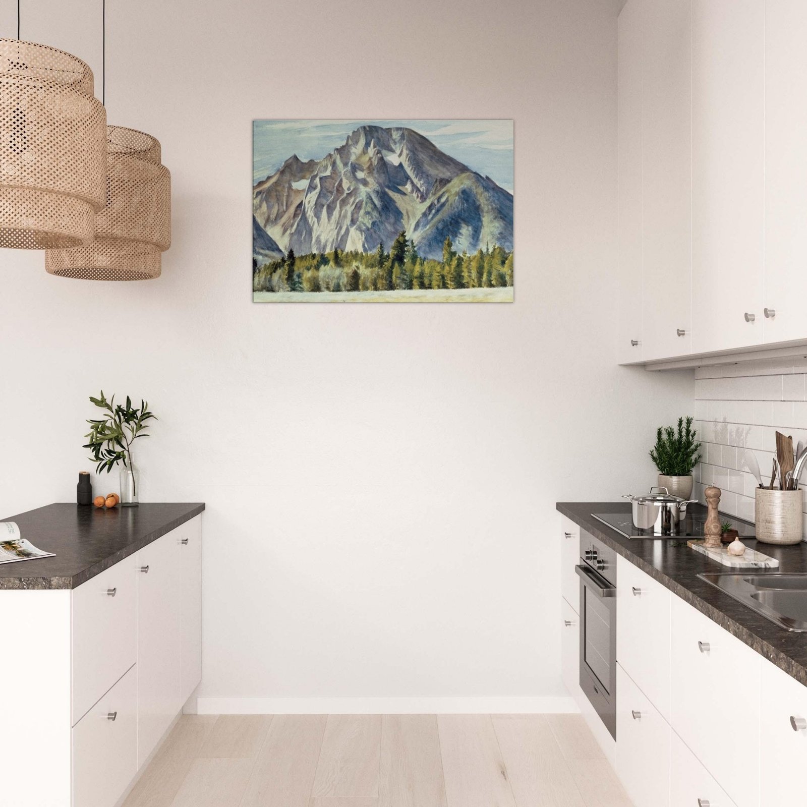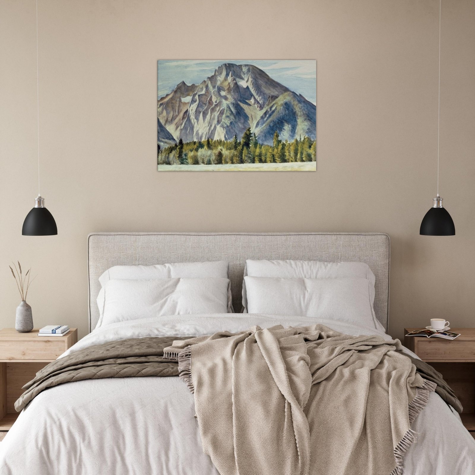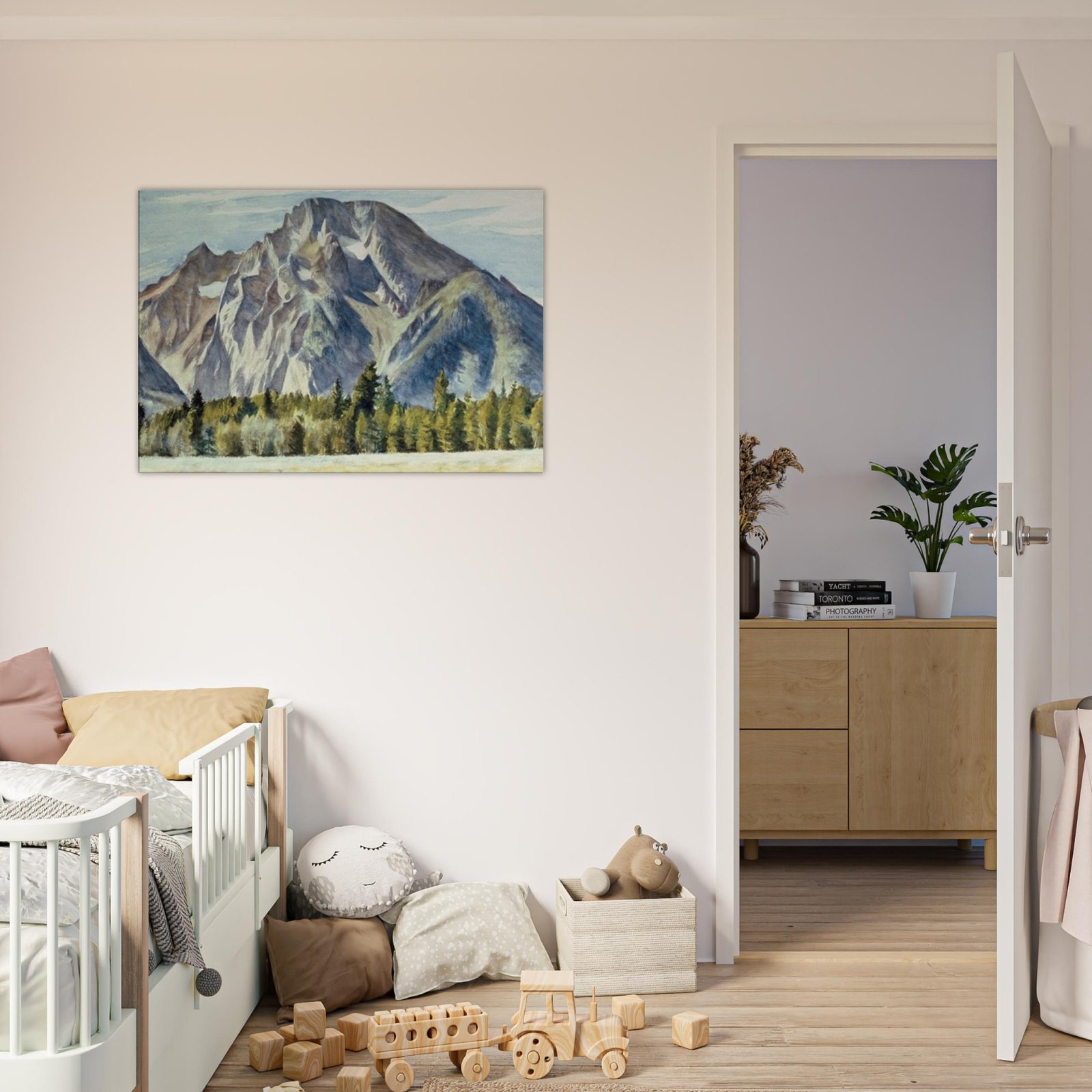 Transform your space with our Majestic Mountain Canvas Print, featuring a breathtaking view of towering mountains and serene trees nestled in a lush valley. This stunning artwork brings the beauty of nature indoors, adding a touch of tranquility to any room.